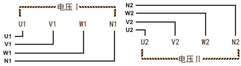 監(jiān)測電壓輸入:電壓I和電壓Ⅱ:兩路獨(dú)立的三相四線電壓輸入;并接在被監(jiān)測電壓上,注意U、V、W、N線的順序及極性。